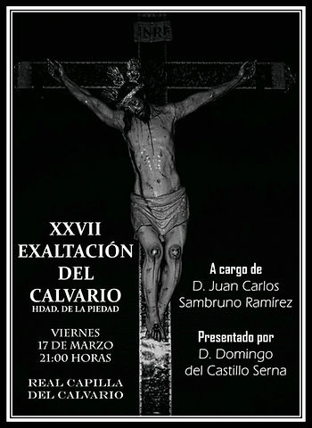 Este viernes 17, a las 21:00 horas, tendrá lugar en la Real Capilla del Calvario la XXVII Exaltación del Calvario. Dicho acto estará a cargo de D. Juan Carlos Sambruno Ramírez, Cofrade de las Hermandades de Ntro. Padre Jesús de la Redención y de Ntro. Padre Jesús del Consuelo en el Desprecio de Herodes. A continuación tendrá lugar la presentación de un cartel anunciador del Viernes Santo, obra fotográfica y diseño de D. Javier Romero Díaz y con el patrocinio de Doble G Actuaciones Integrales.